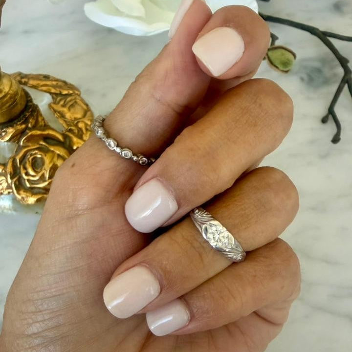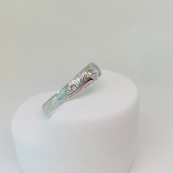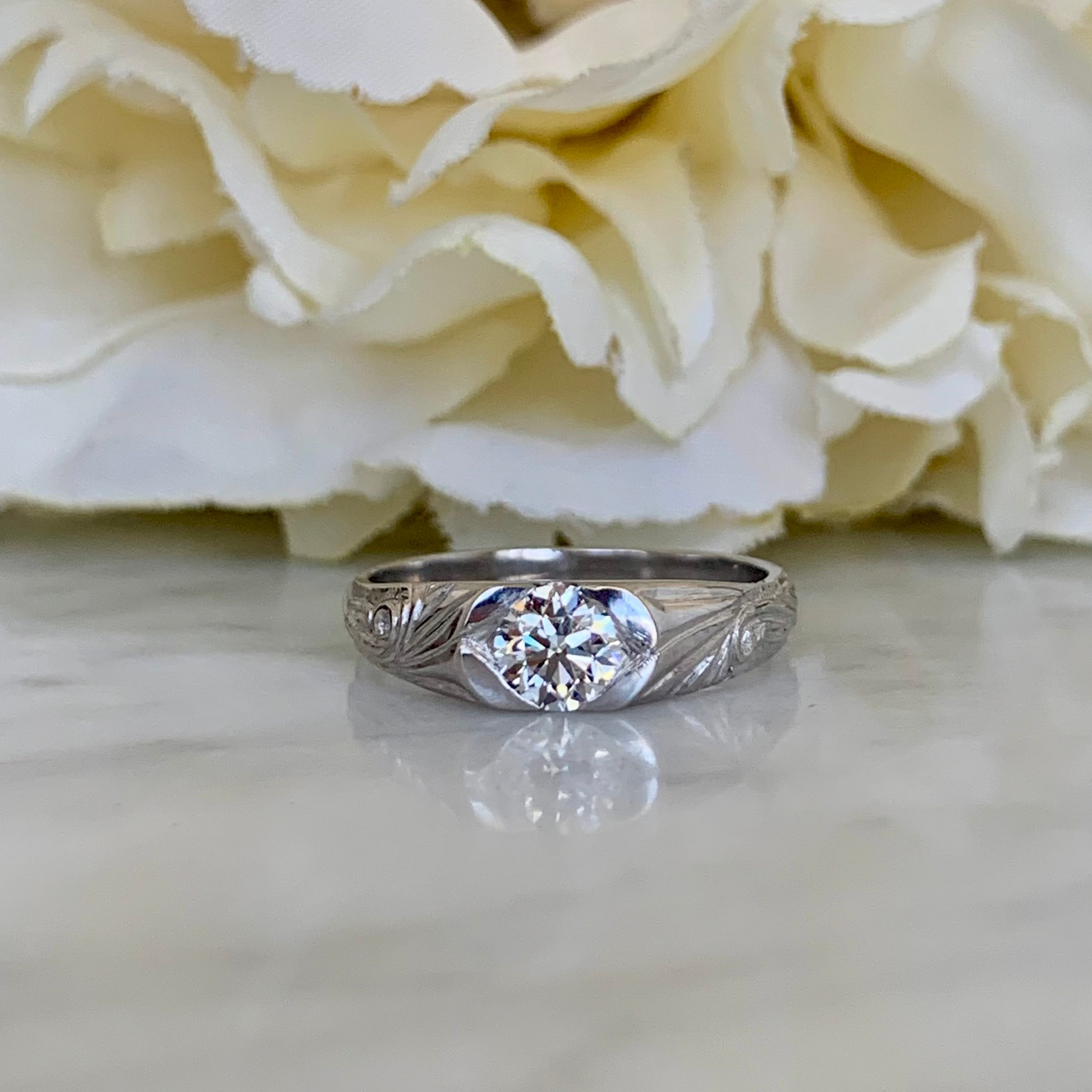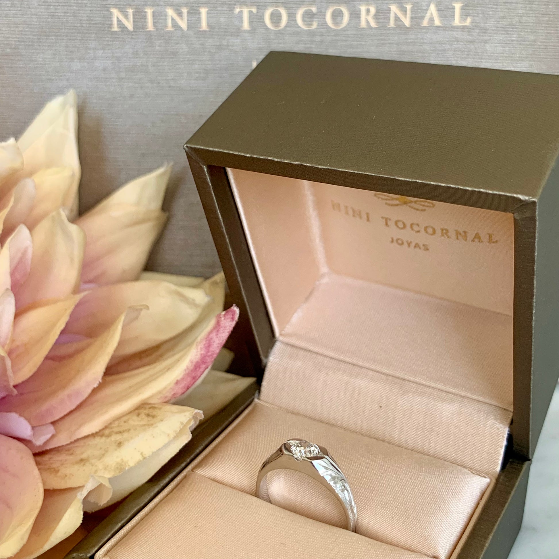 Anillo de platino con un Diamante Central GIA de 0,50 ct, en engaste invisible y argolla con diseño floral grabada a mano.