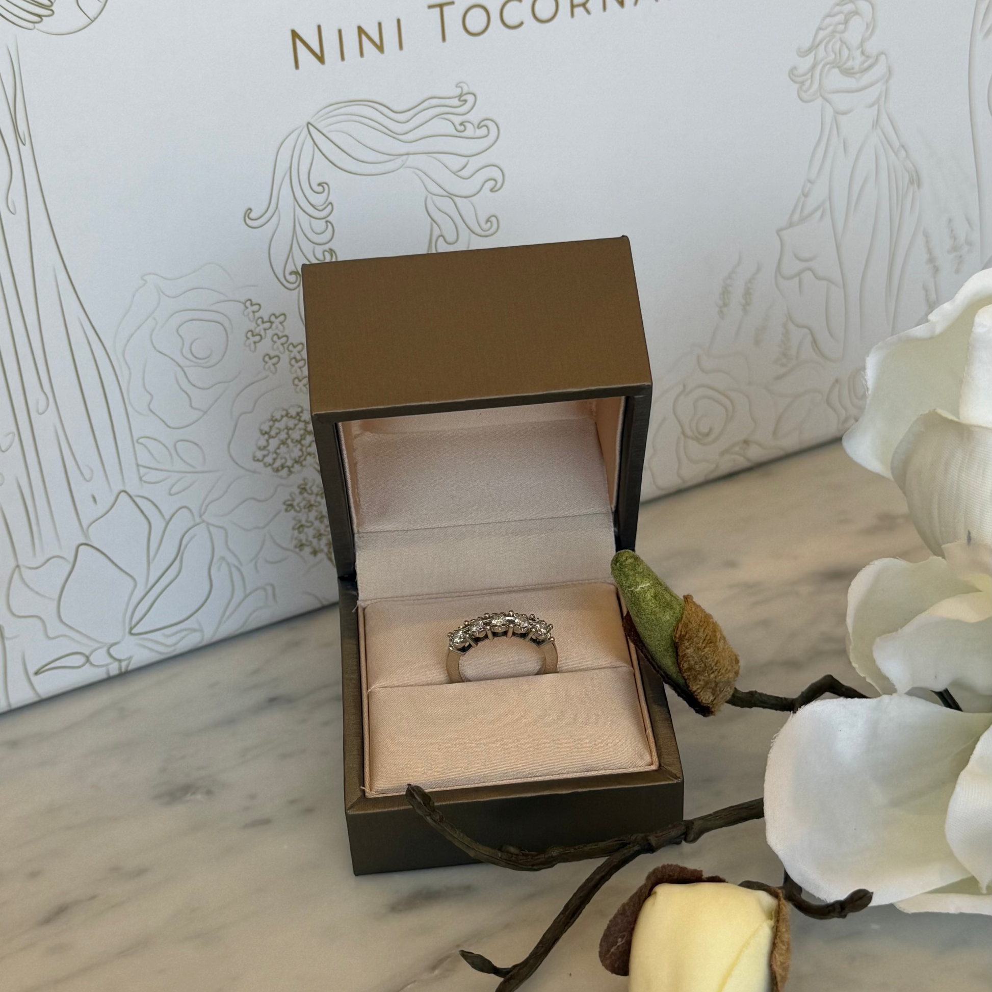 Anillo de platino con 5 brillantes de 0.07 ct cada uno, en engaste milagroso. Talla 10