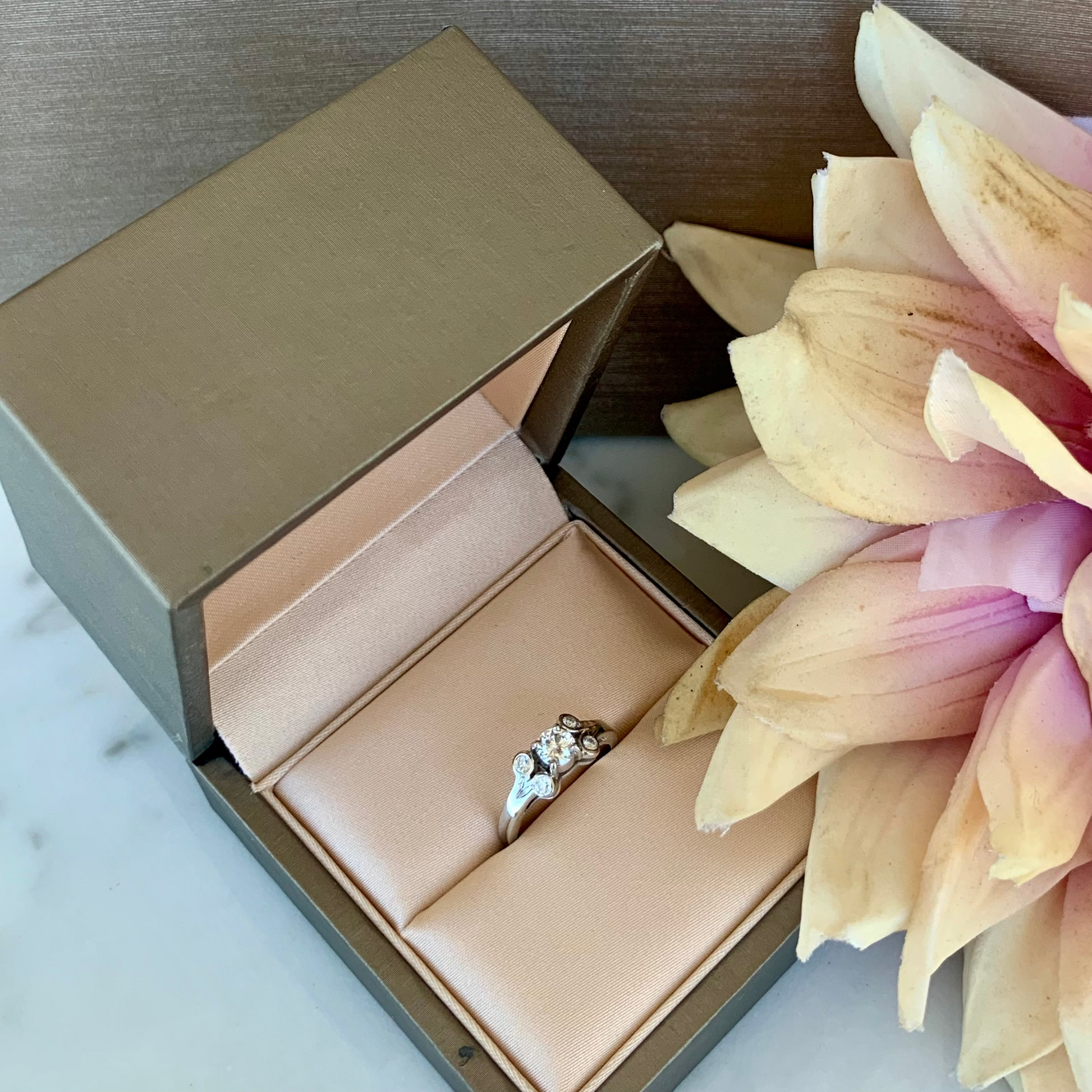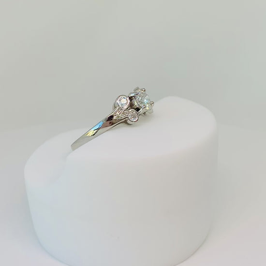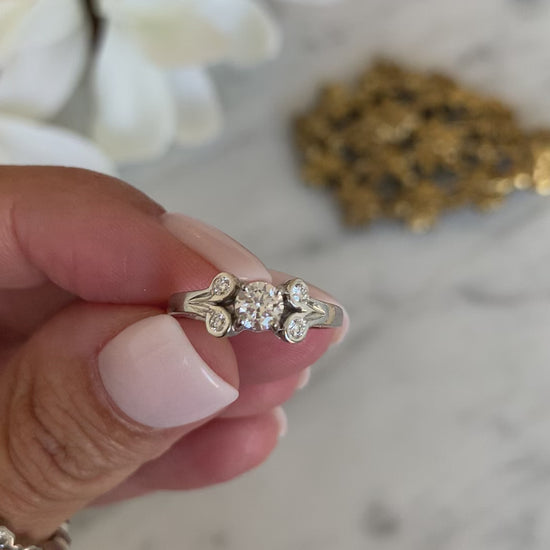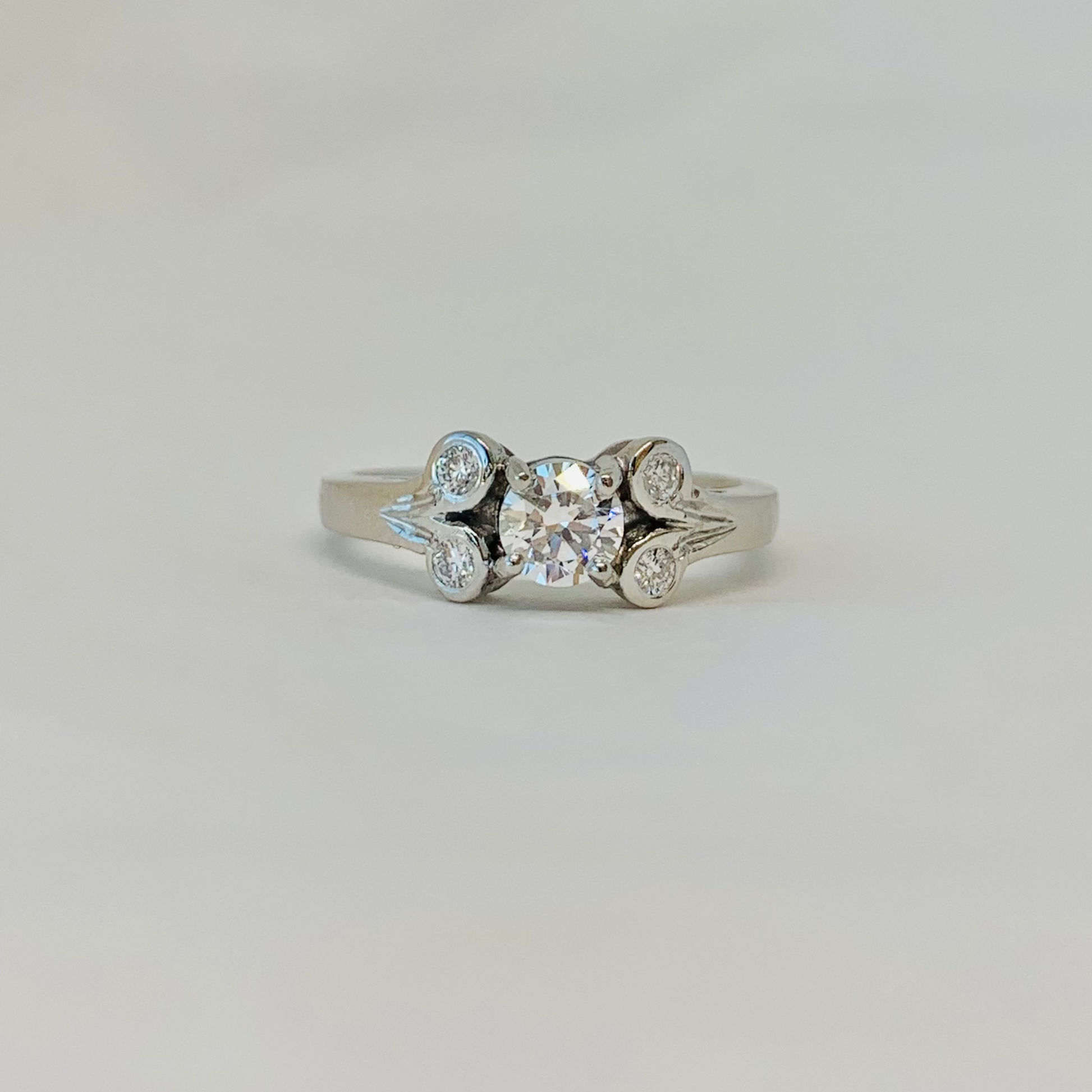 Anillo de platino con diamante central de 0.31 ct, acompañado de 4 brillantes de 0.02 ct cada uno.