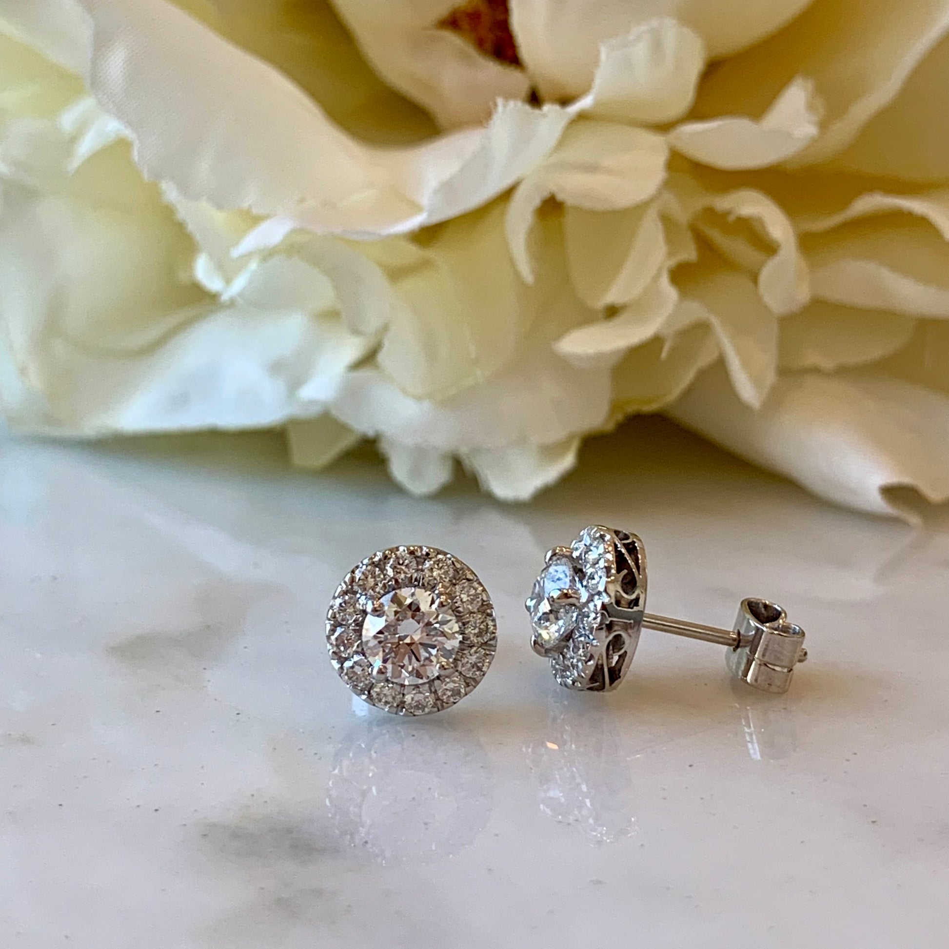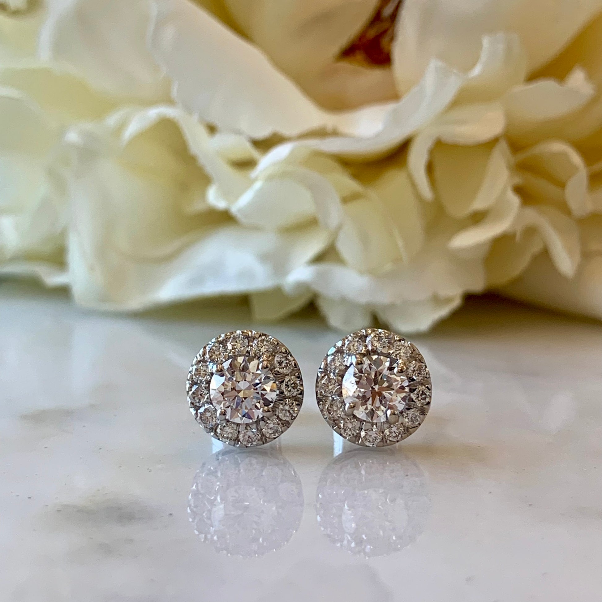 Aros de platino con un Diamante central de 0.50 ct cada uno y rodeados de 26 brillantes de 0.02 ct cada uno, engastado en grifas.