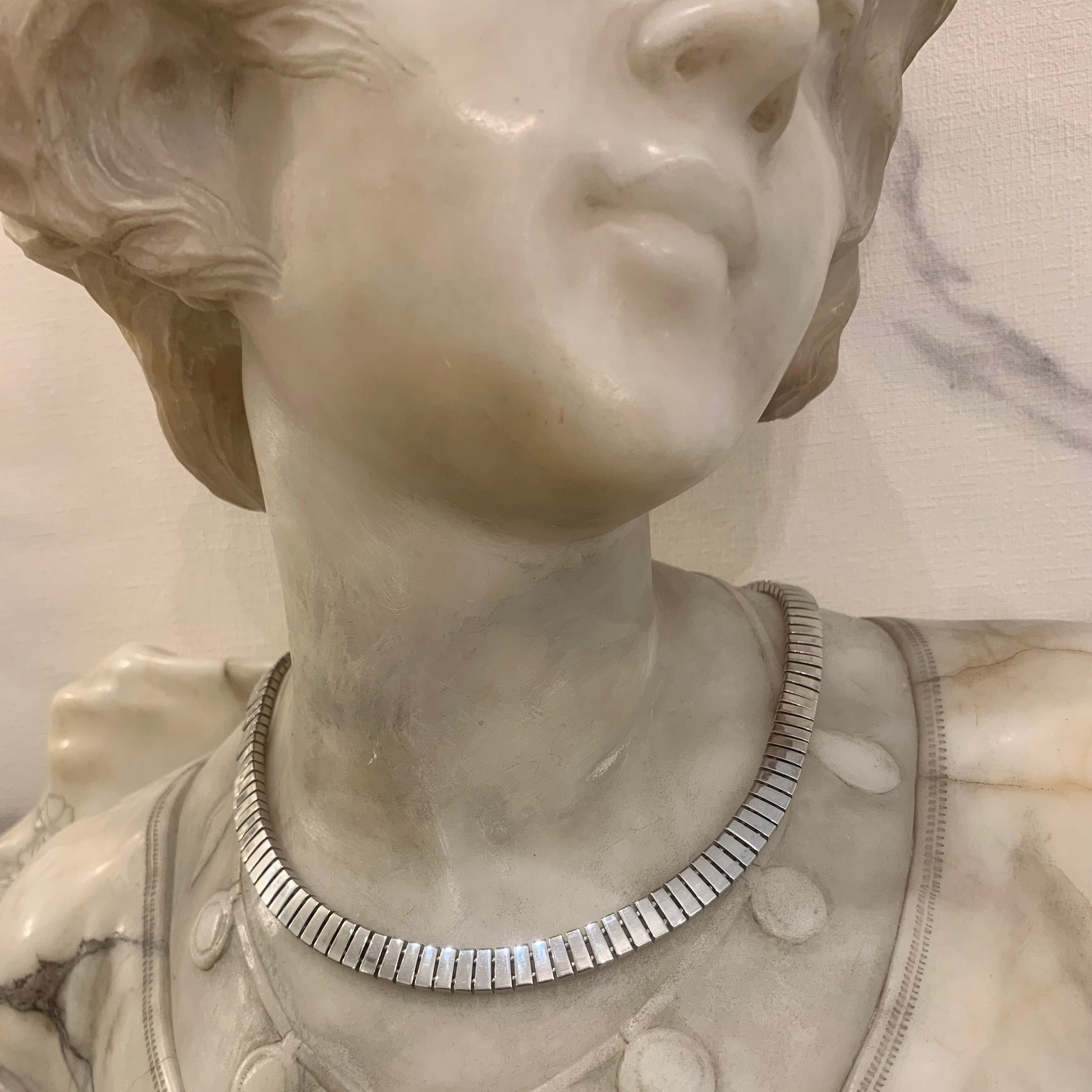 Collar de oro blanco 18k, con piezas rectangulares en degrade de tamaño, peso 57,5 gr.