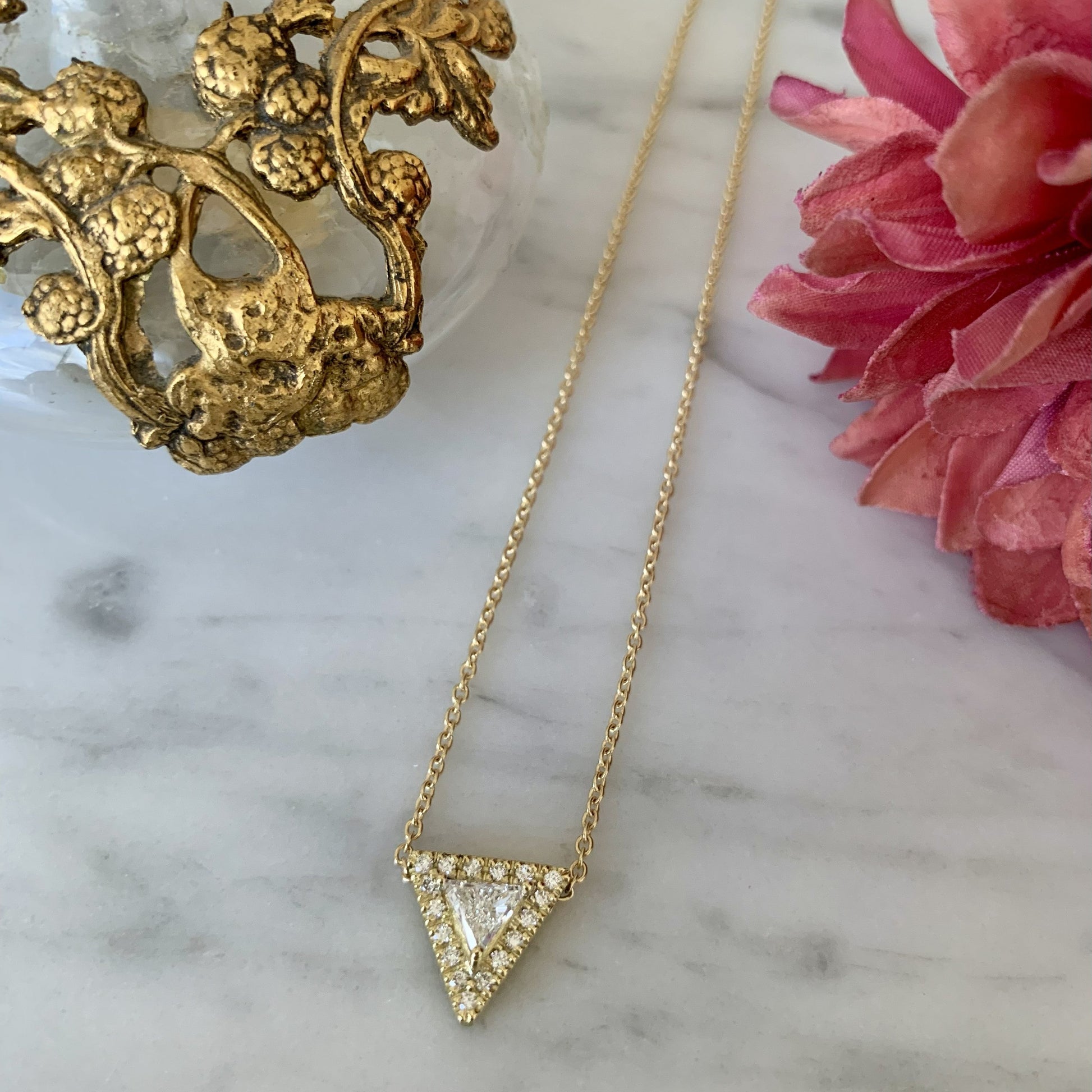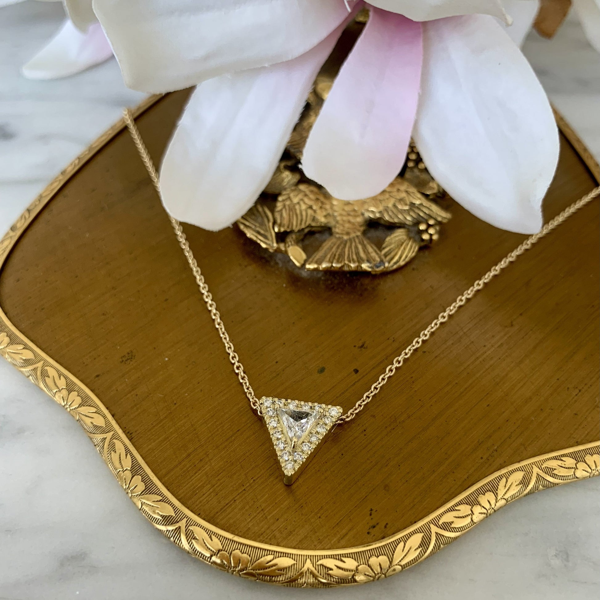 Collar de oro amarillo 18k, con un Diamante central corte Trillion de 0,60 ct, rodeado de 15 brillantes de 0.015 ct cada uno, engastado en microgrifas.