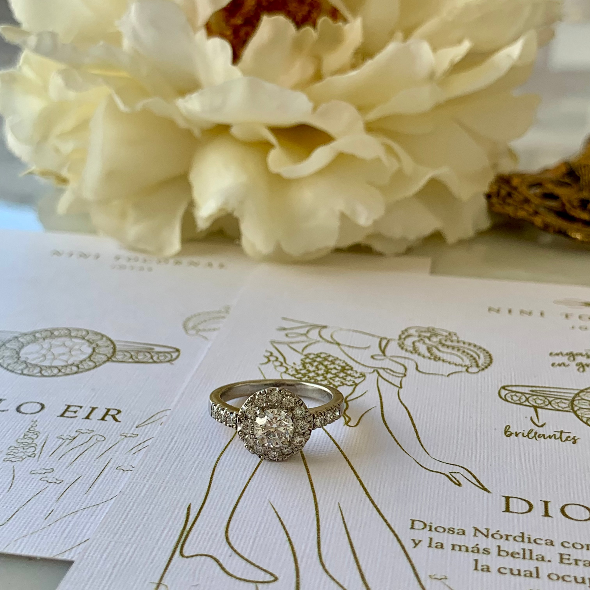 Anillo de platino con un brillante central de 0.61 ct, rodeado de 18 brillantes de 2 puntos, acompañado además con brillantes en la argolla.