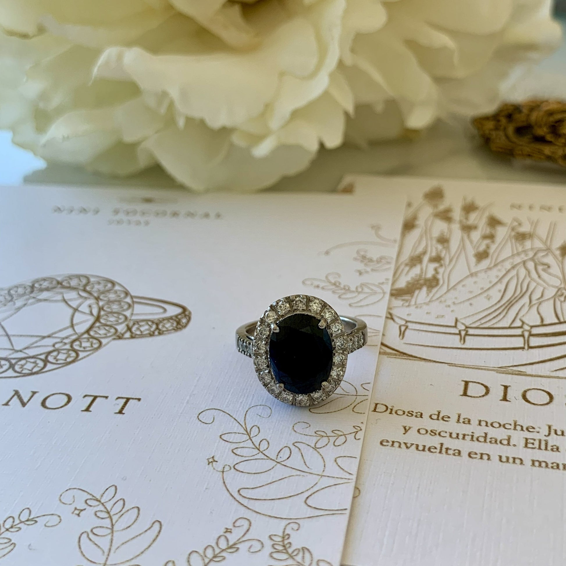 Anillo de platino con un Zafiro oval diffusion de 4.71 ct engastado en 4 grifas, rodeado de 20 brillantes de 0.02 ct cada uno, y acompañado de 6 brillantes de 0.02 ct cada uno en la argolla.